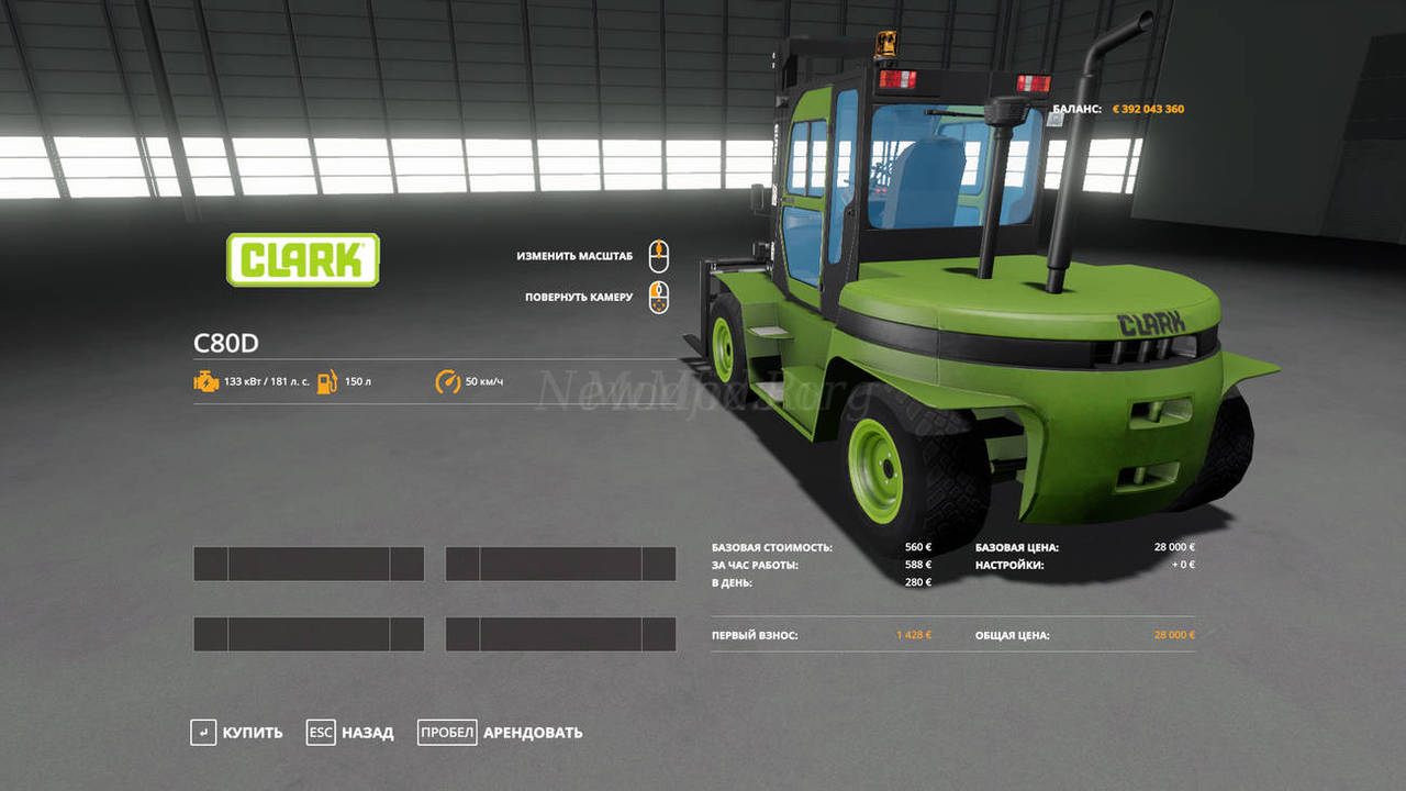 Forklift for working in the Farming 19 simulator, with a capacity of 181 horsepower. The cost of the model is 28,000 rubles in gaming.
