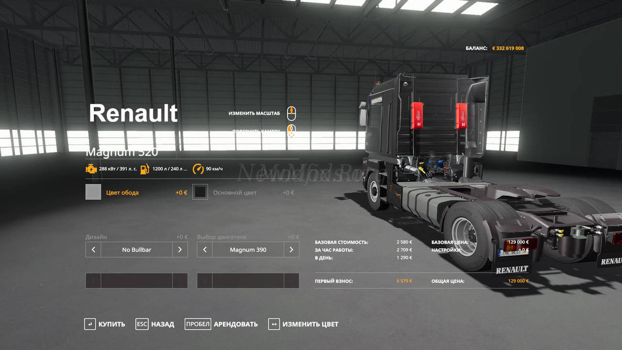 You can choose from the FS19 store: the color of the cabin and rims, the engine, stickers, and the hood.